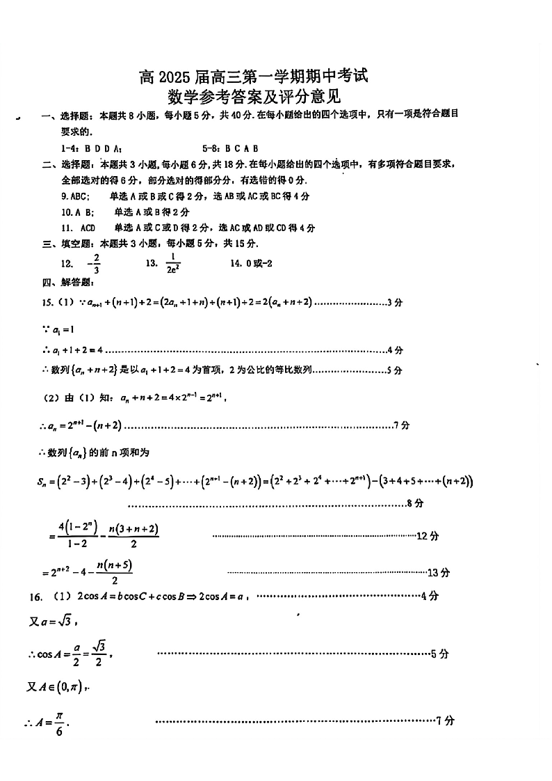重庆市主城五区高2025届高三第一学期期中考试数学答案