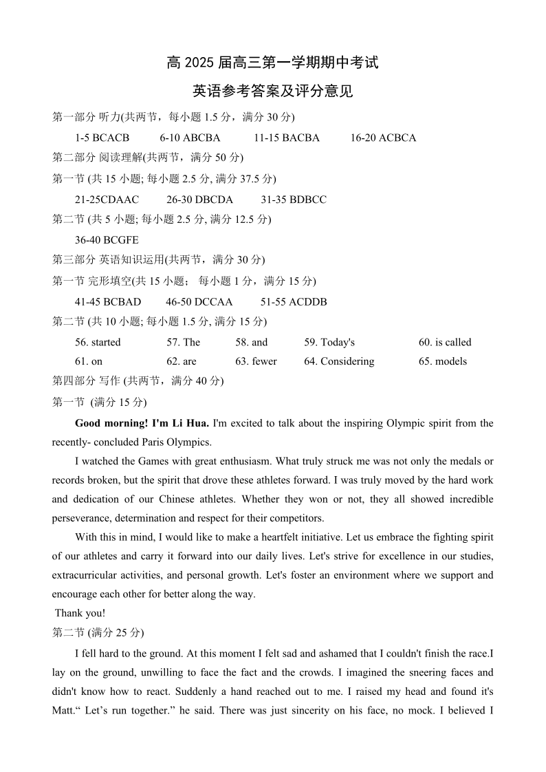 重庆市主城五区高2025届高三第一学期期中考试英语答案