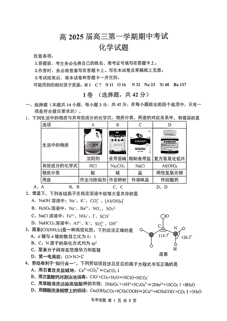 重庆市主城五区高2025届高三第一学期期中考试化学