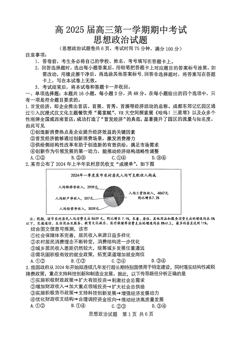 重庆市主城五区高2025届高三第一学期期中考试政治