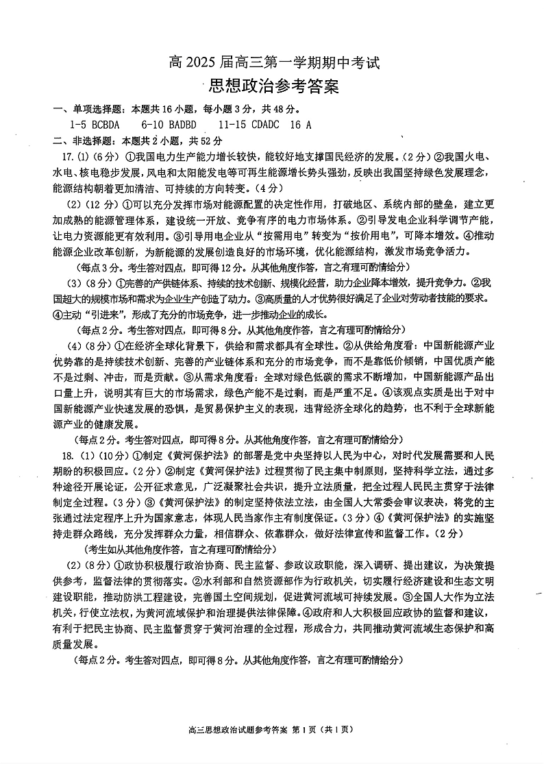 重庆市主城五区高2025届高三第一学期期中考试政治答案