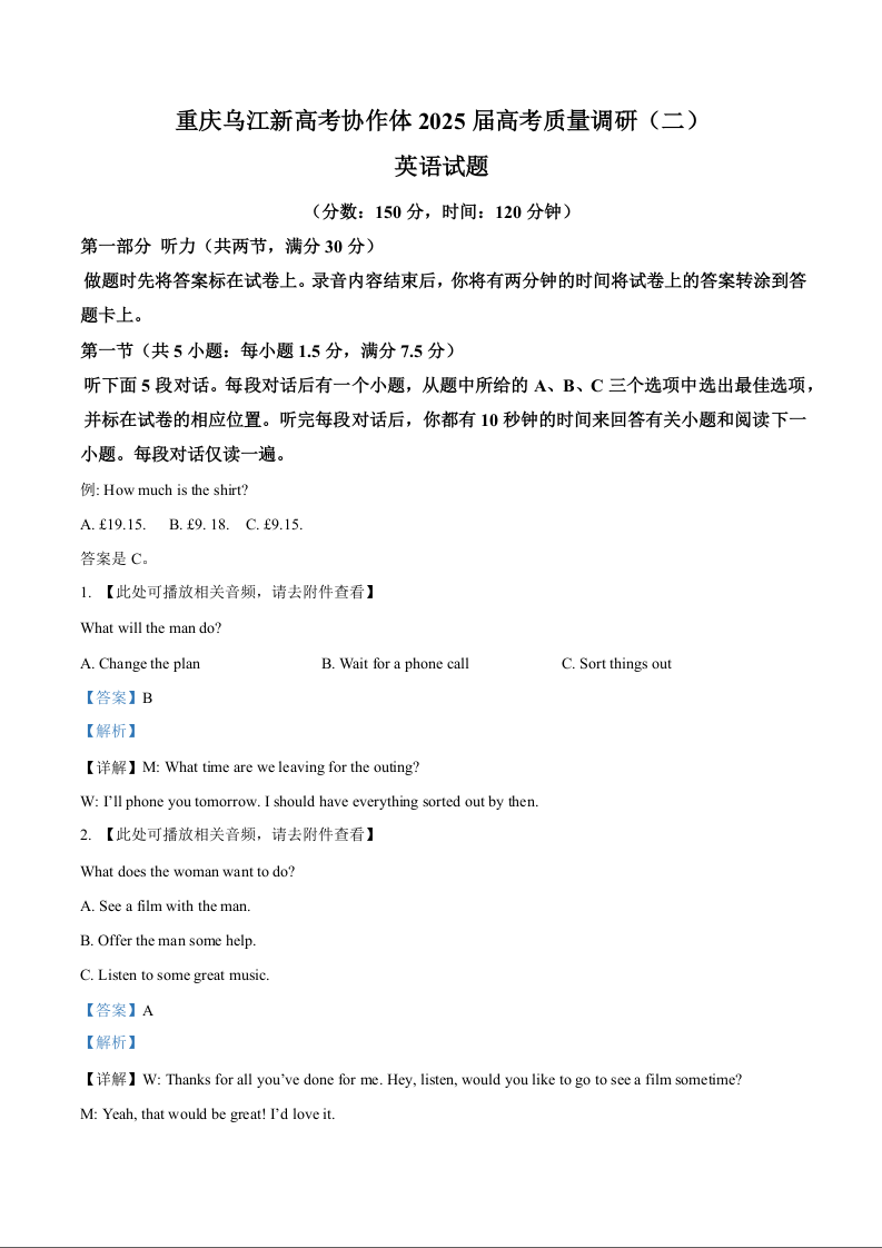 重庆乌江新高考协作体2025届高考质量调研(二)英语试题 Word版含解析