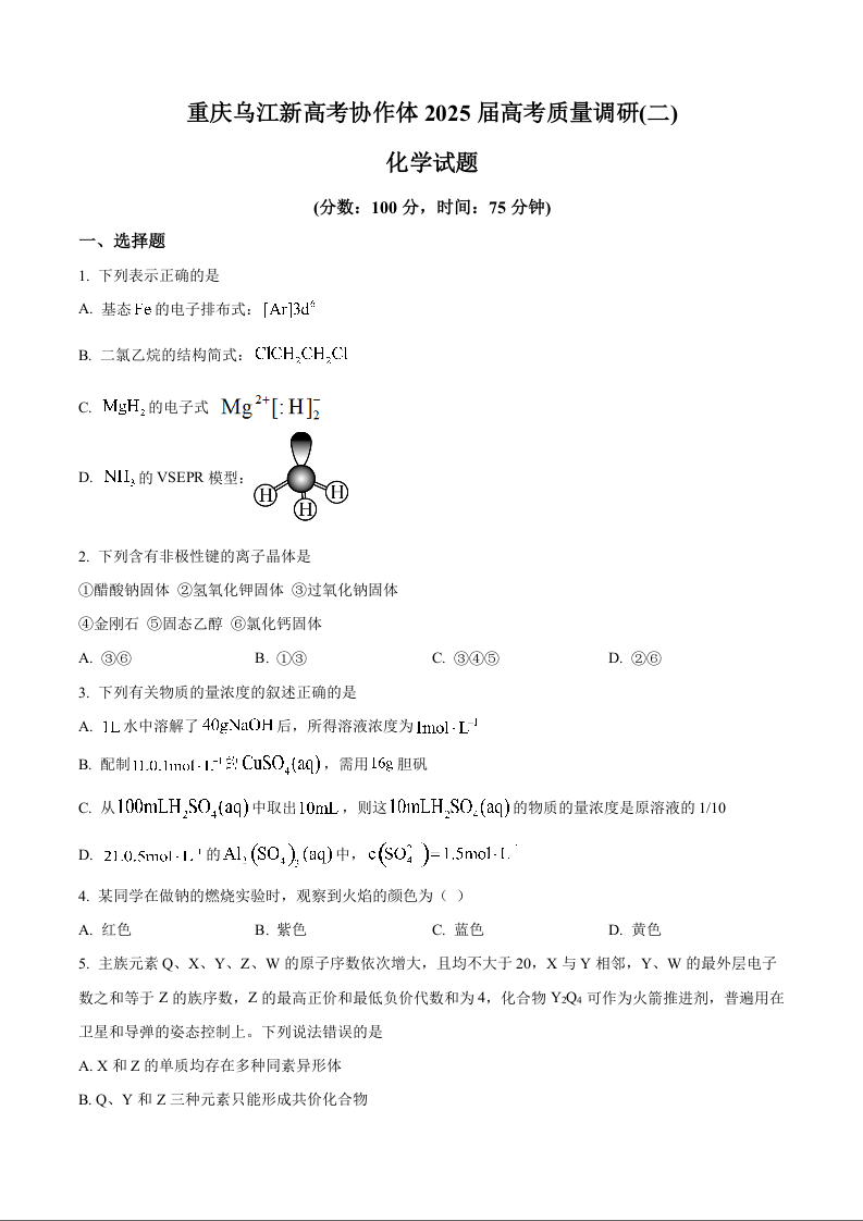 重庆乌江新高考协作体2025届高考质量调研(二)化学试题