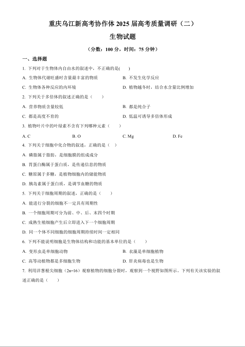 重庆乌江新高考协作体2025届高考质量调研(二)生物试题