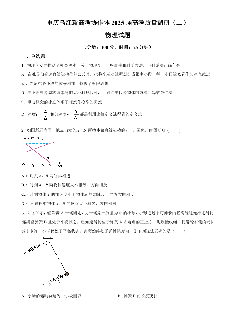 重庆乌江新高考协作体2025届高考质量调研(二)物理试题
