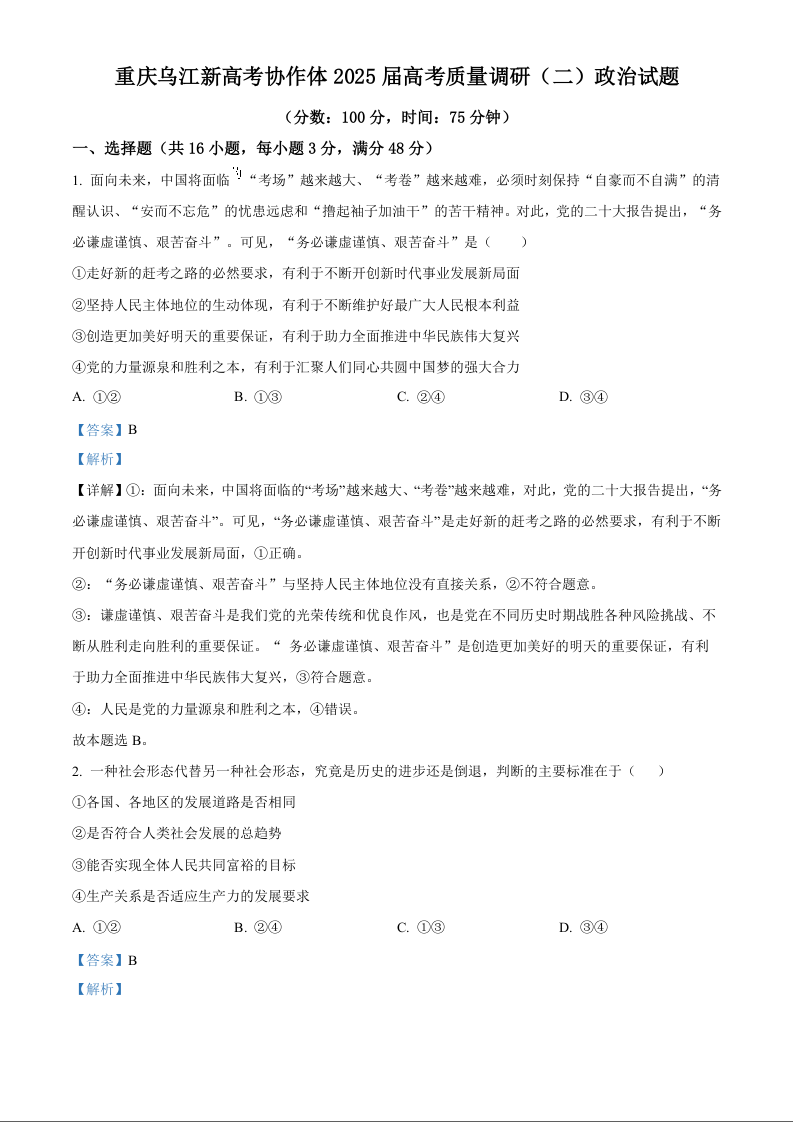 重庆乌江新高考协作体2025届高考质量调研(二)政治试题 Word版含解析