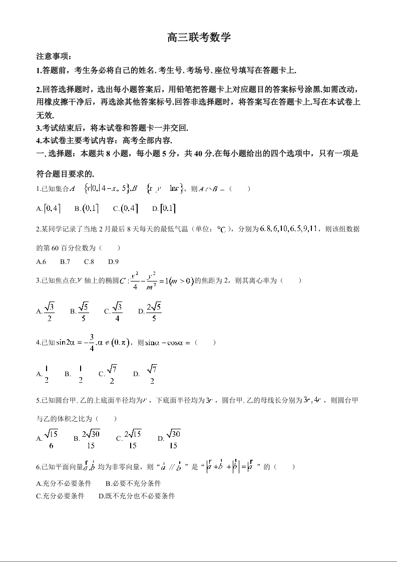 贵州省部分高中2025届高三上学期10月联考数学试题+答案