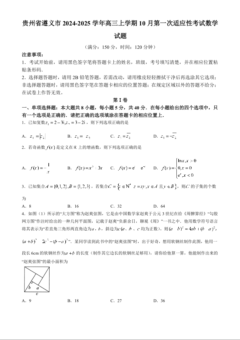 贵州省遵义市2025届高三上学期第一次适应性考试(一模)数学