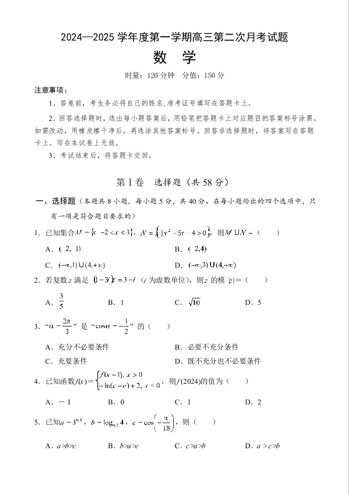 海南省文昌中学2025届高三上学期第二次月考数学+答案