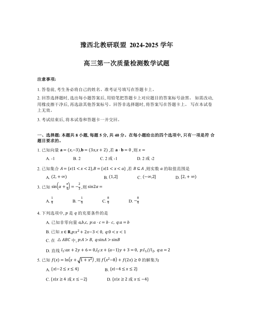 河南省豫西北教研联盟2025届高三上学期第一次质量检测数学试卷