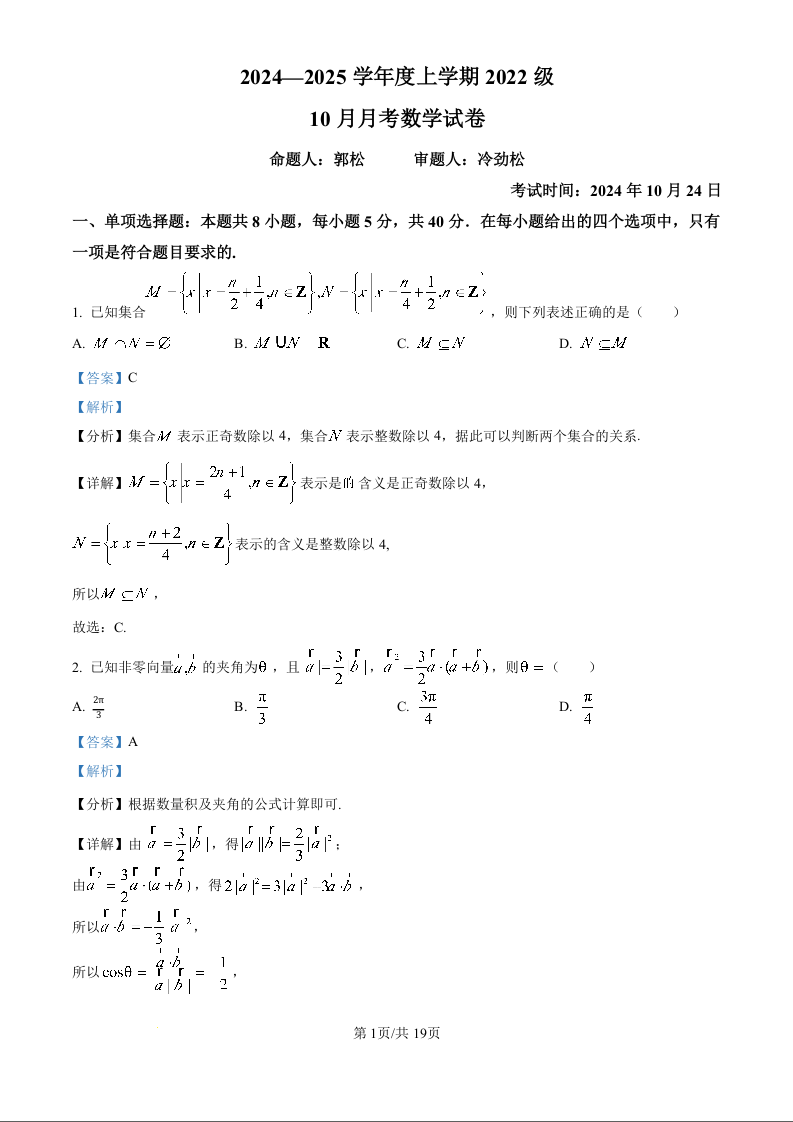 湖北省荆州市沙市中学2024-2025学年度上学期2022级10月月考(解析版)