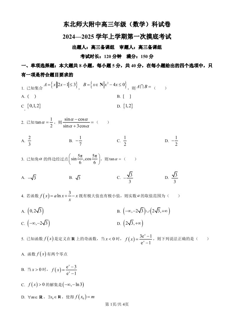 吉林省东北师范大学附属中学2024-2025学年高三上学期第一次摸底考试数学试卷(原卷版)