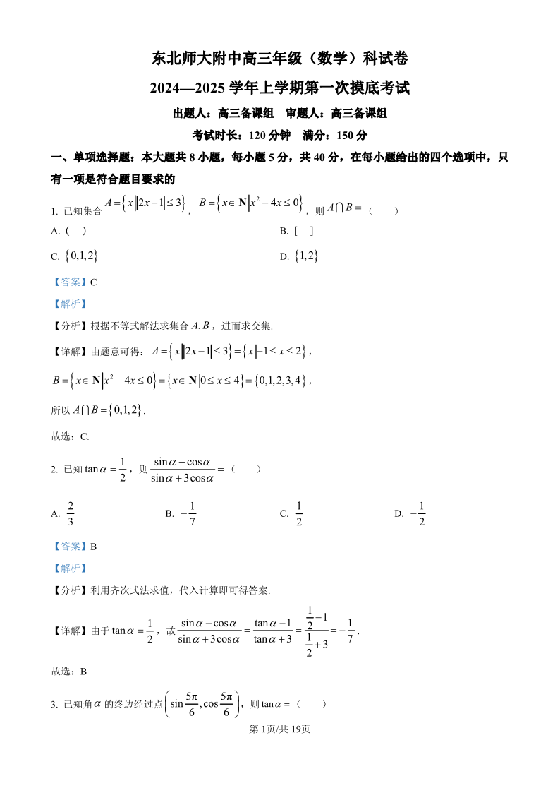 吉林省东北师范大学附属中学2024-2025学年高三上学期第一次摸底考试数学试卷(解析版)