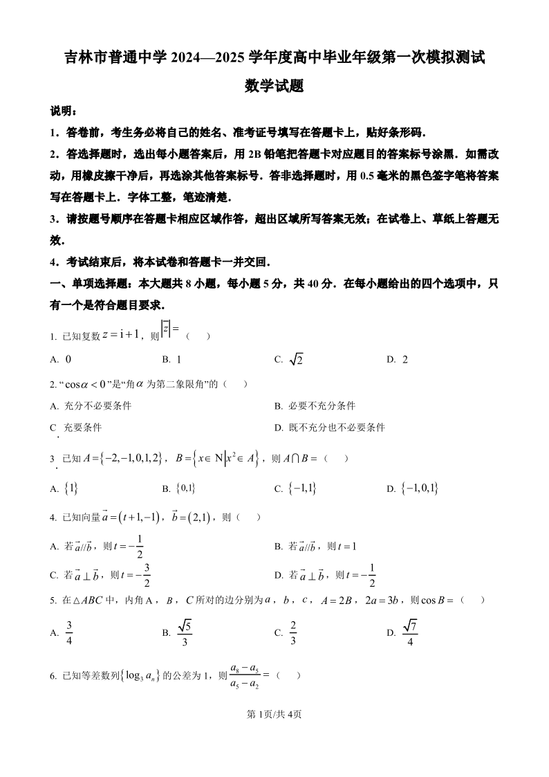 吉林市普通中学2025届高三上学期第一次模拟测试(原卷版)