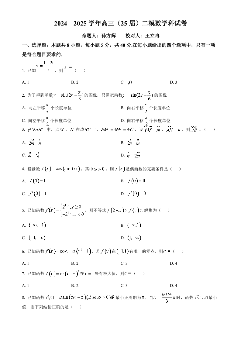 辽宁省鞍山市第一中学2025届高三上学期10月二模数学+答案