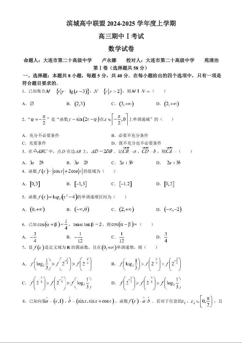 辽宁省大连市滨城高中联盟2025届高三上学期期中考试数学+答案