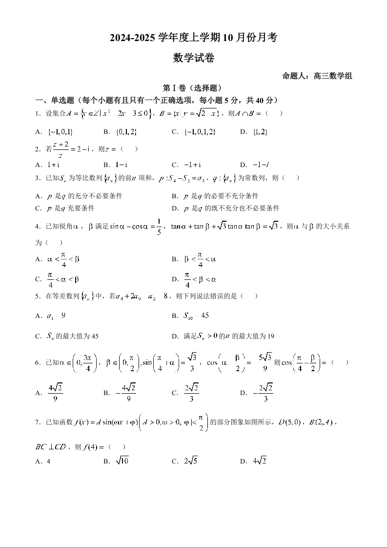 辽宁省沈阳市2025届重点学校高三上学期10月月考数学