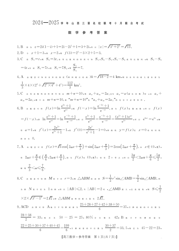 山西省三晋名校2024-2025学年高三上学期10月联合考试数学答案
