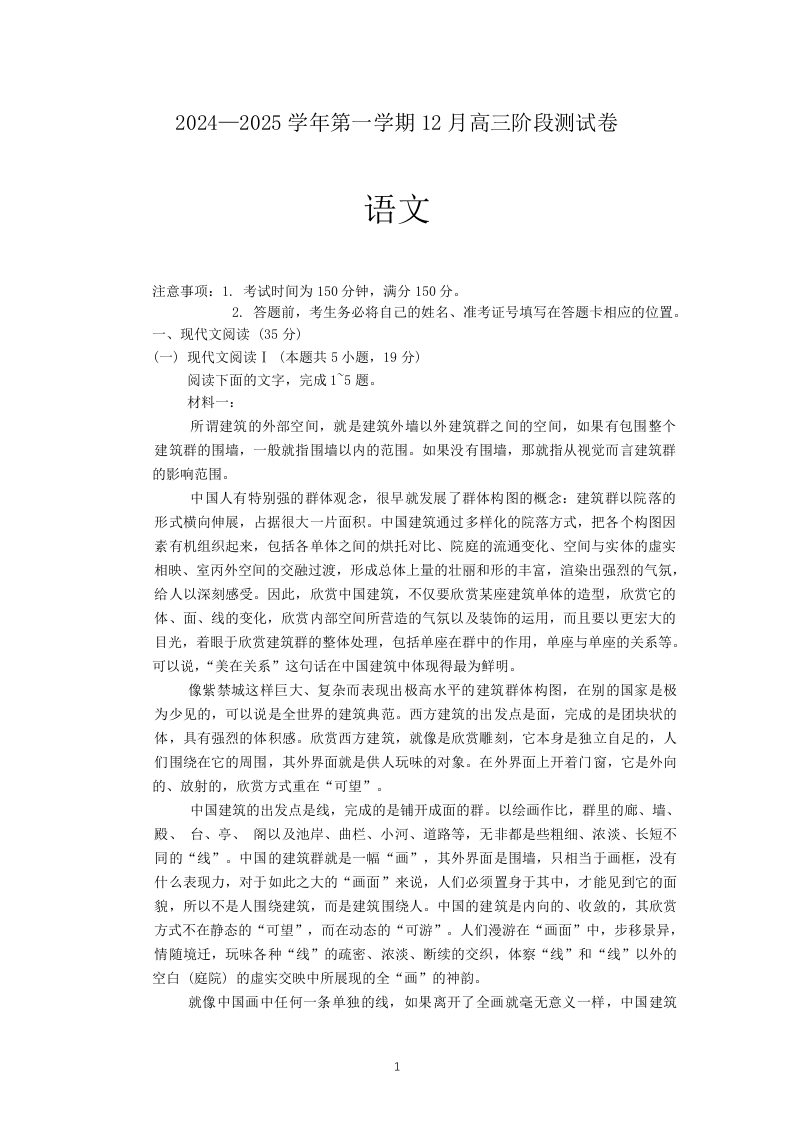 河北省部分学校2024—2025学年高三上学期12月阶段性测试语文
