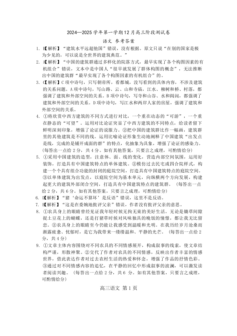 河北省部分学校2024—2025学年高三上学期12月阶段性测试语文答案
