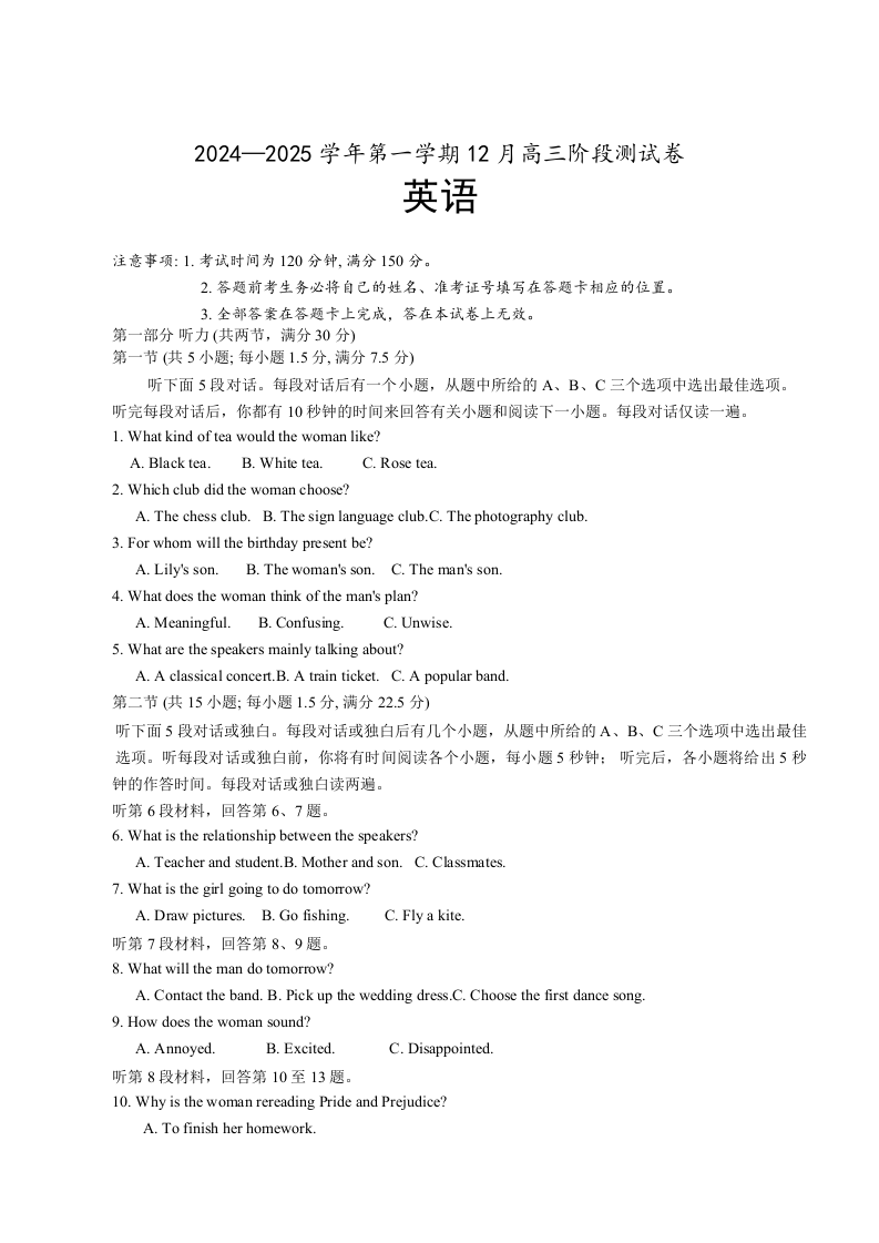 河北省部分学校2024—2025学年高三上学期12月阶段性测试英语