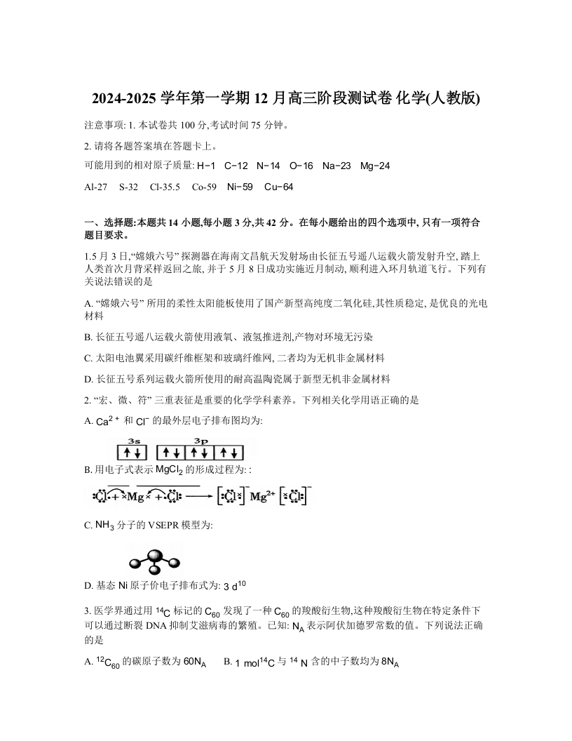 河北省部分学校2024—2025学年高三上学期12月阶段性测试化学