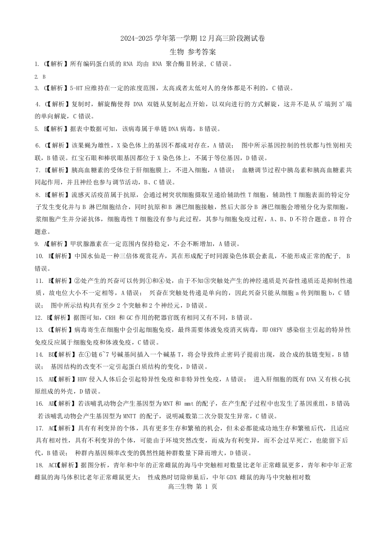 河北省部分学校2024—2025学年高三上学期12月阶段性测试生物答案