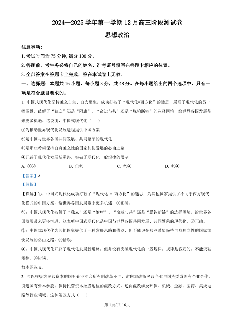 河北省部分学校2024—2025学年高三上学期12月阶段性测试政治(精品解析版)