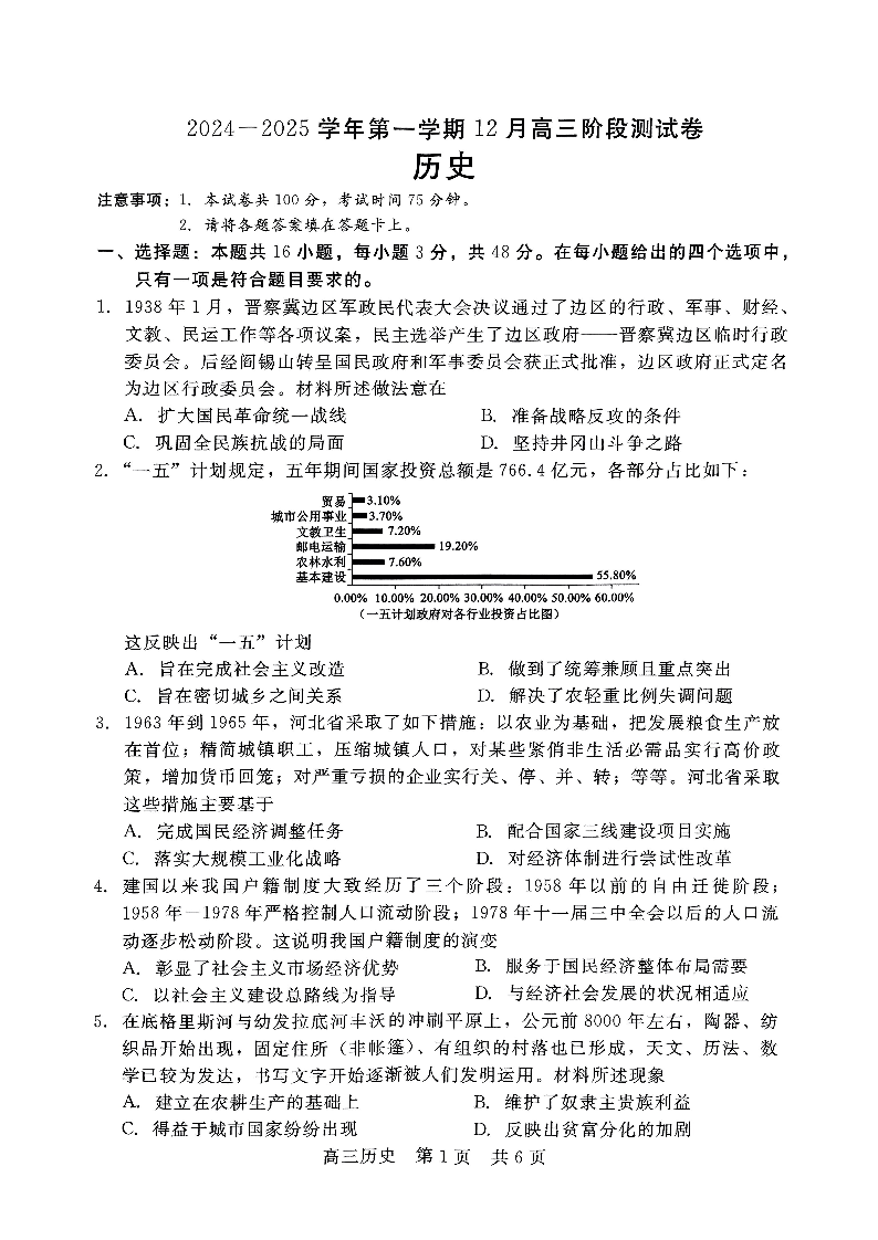 河北省部分学校2024—2025学年高三上学期12月阶段性测试历史