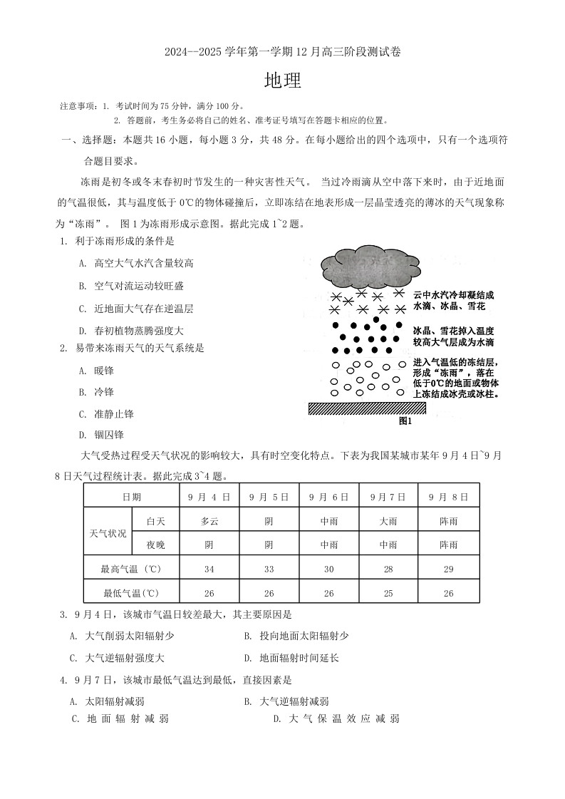 河北省部分学校2024—2025学年高三上学期12月阶段性测试地理含答案