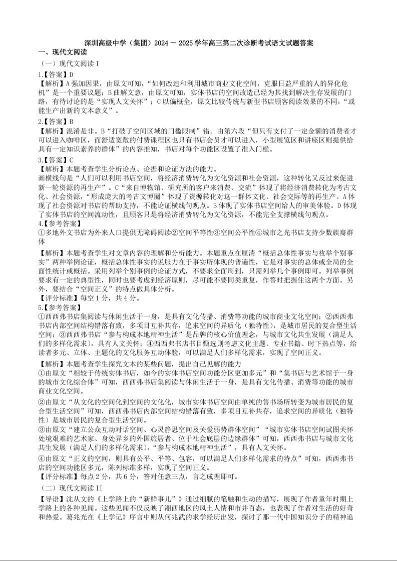 广东省深圳市高级中学2025届高三上学期第二次诊断考试语文答案