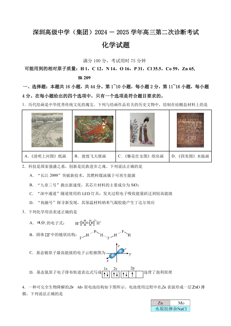 广东省深圳市高级中学2025届高三上学期第二次诊断考试化学