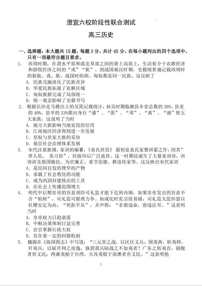 江苏省无锡市澄宜六校2025届高三上学期12月联考历史