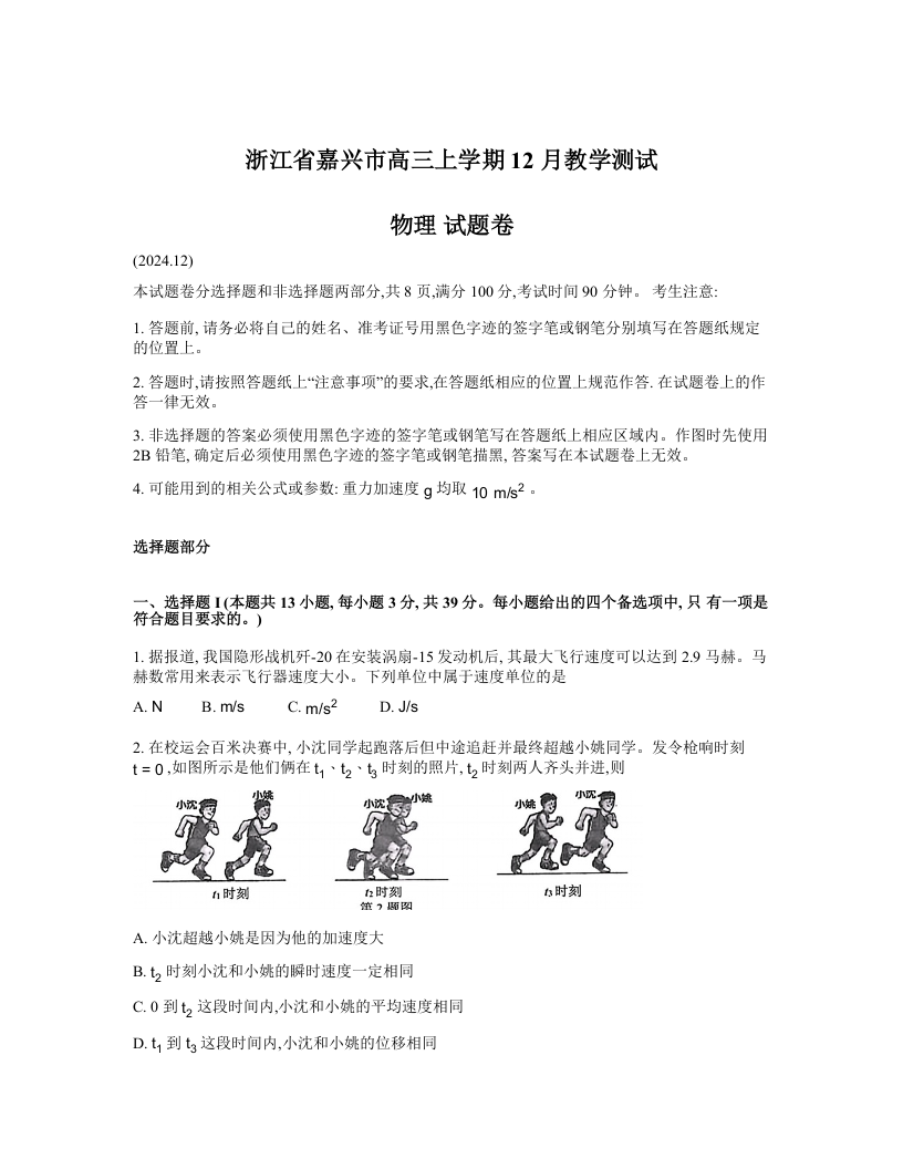 浙江省嘉兴市2025届高三上学期12月教学测试(一模)物理