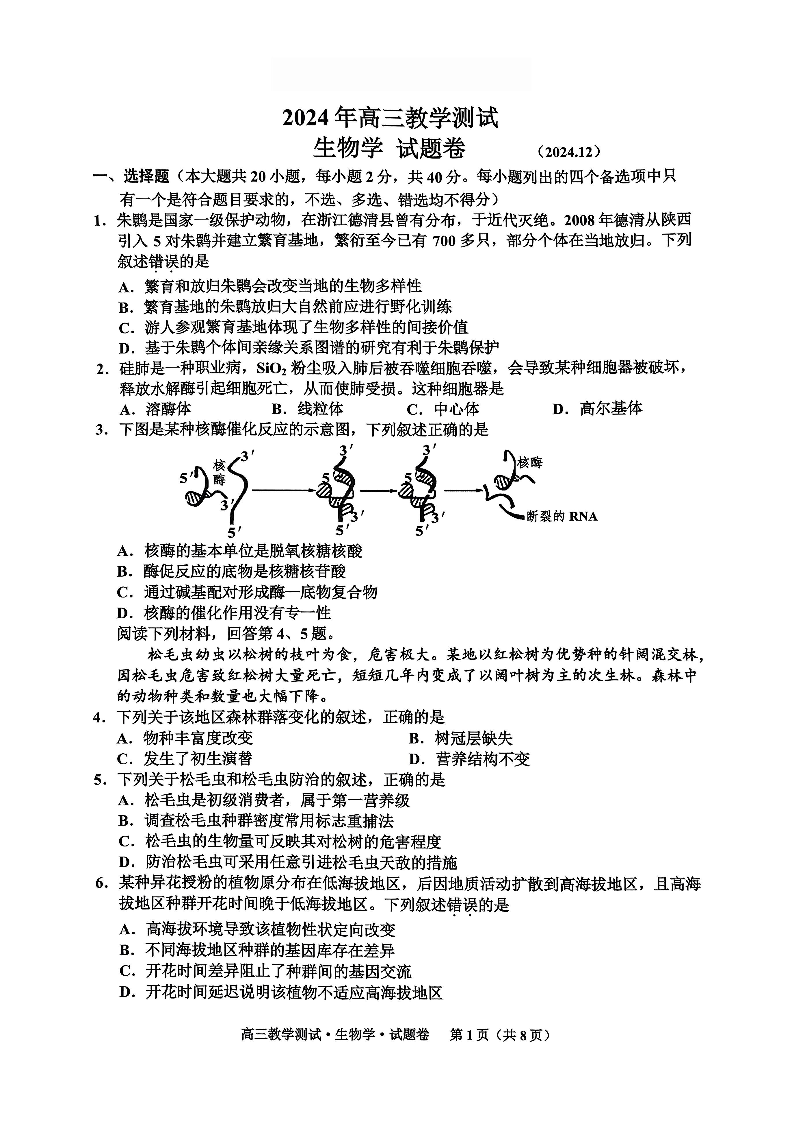 浙江省嘉兴市2025届高三上学期12月教学测试(一模)生物