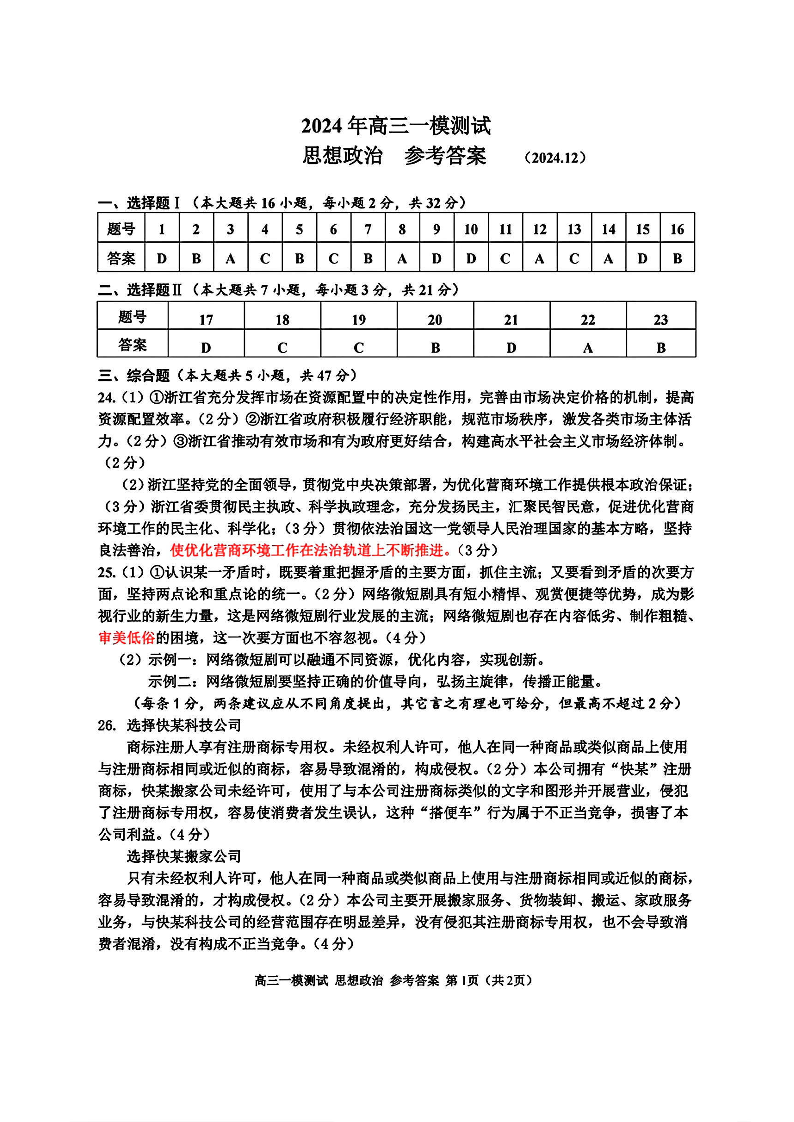 浙江省嘉兴市2025届高三上学期12月教学测试(一模)政治答案