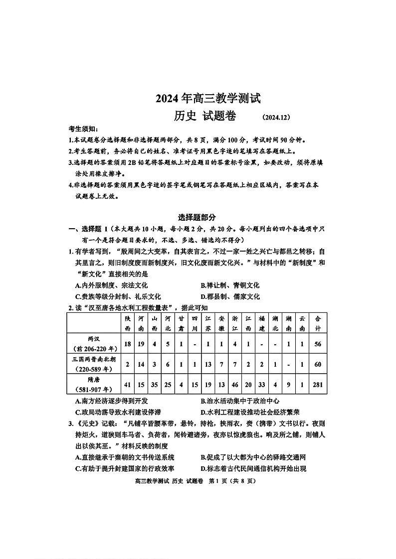 浙江省嘉兴市2025届高三上学期12月教学测试(一模)历史含答案