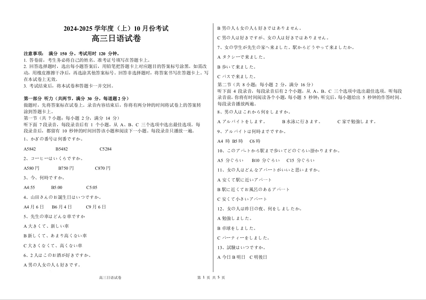 黑龙江省佳木斯市第八中学2025届高三上学期10月月考日语试卷