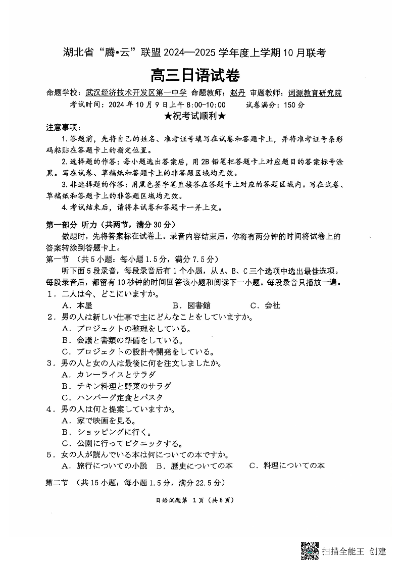 湖北省腾云联盟2024-2025学年度上学期10月联考日语试卷
