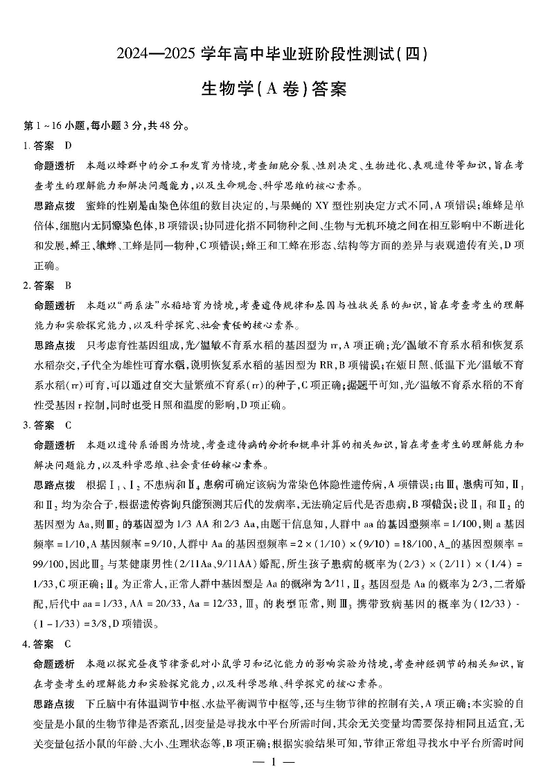 河南省天一大联考2025届高中毕业班阶段性测试(四)生物答案