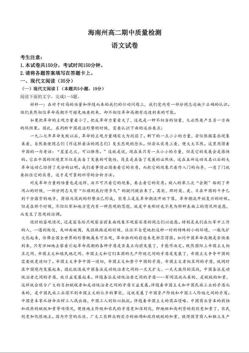 青海省海南州2024-2025学年高二上学期期中质量检测语文含答案