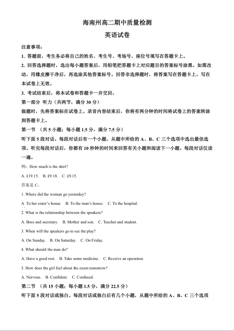 青海省海南州2024-2025学年高二上学期期中质量检测英语(精品解析版)