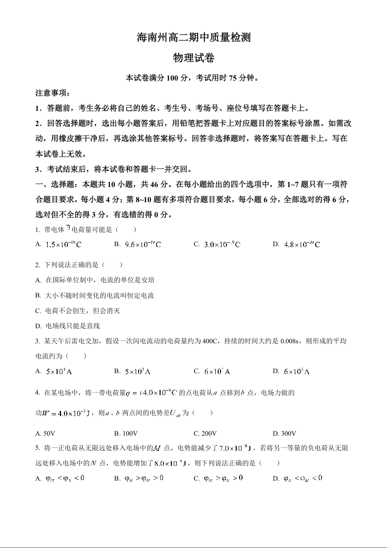 青海省海南州2024-2025学年高二上学期期中质量检测物理(原卷版)