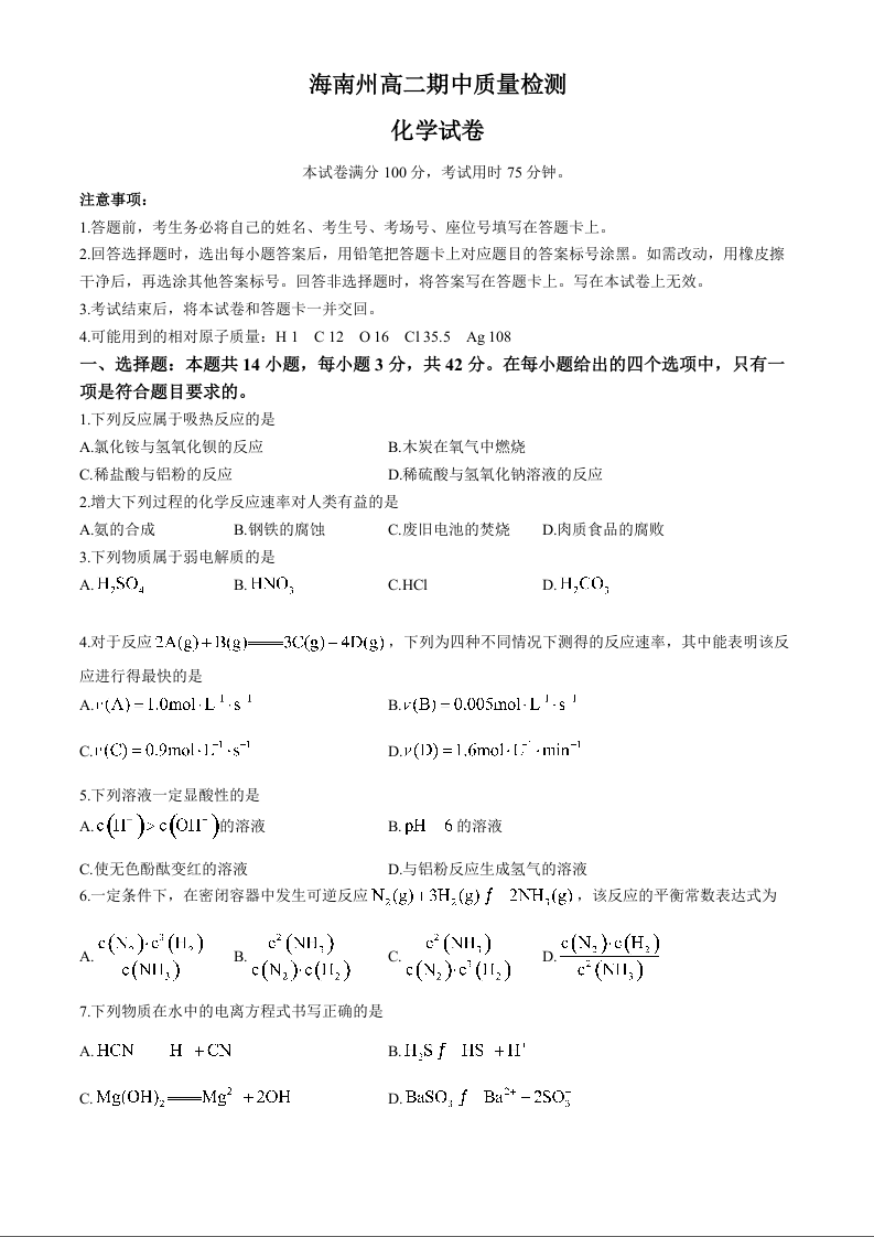 青海省海南州2024-2025学年高二上学期期中质量检测化学含答案