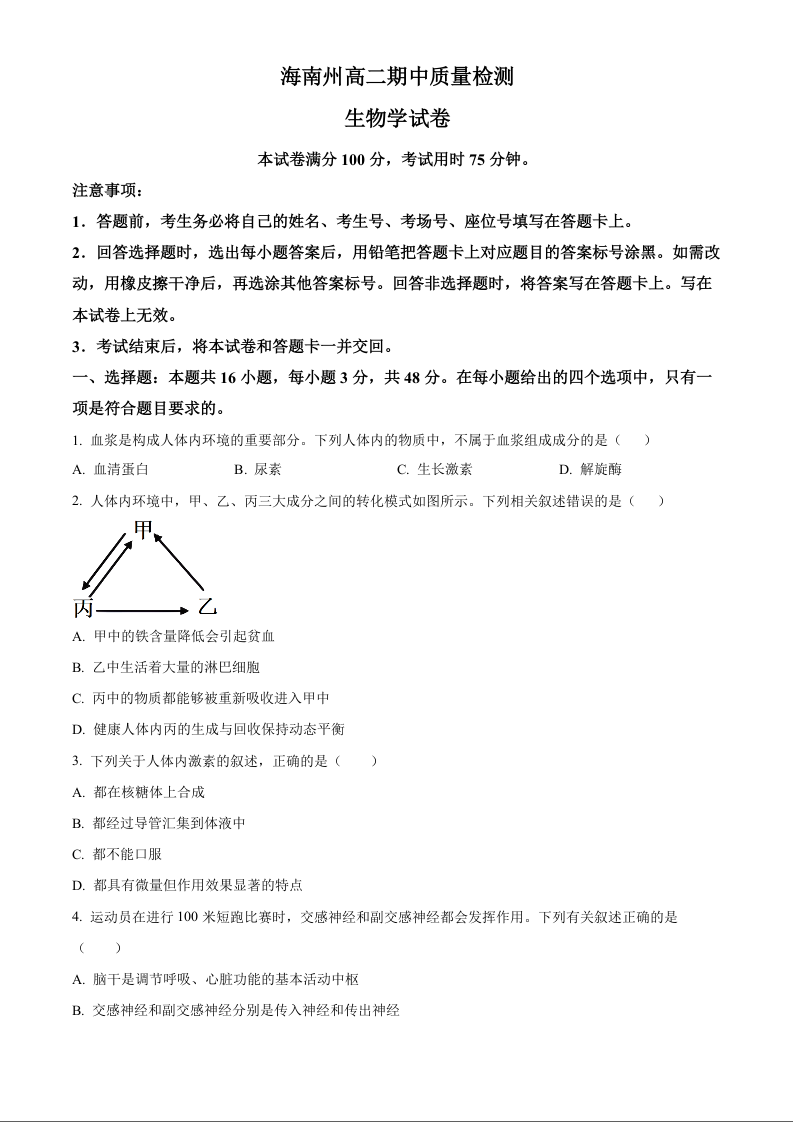 青海省海南州2024-2025学年高二上学期期中质量检测生物(原卷版)