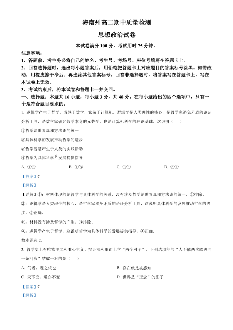 青海省海南州2024-2025学年高二上学期期中质量检测政治(精品解析版)