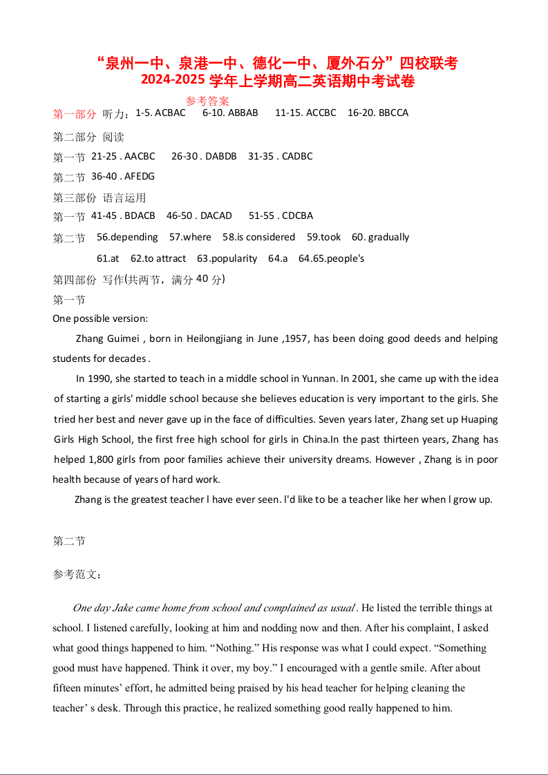 福建省名校协作体四校联考2024-2025学年高二上学期11月期中考试英语答案