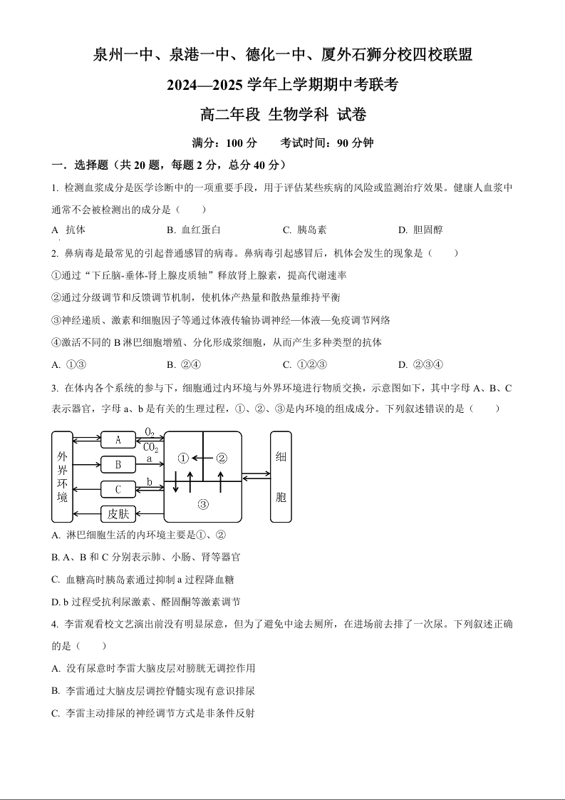 福建省名校协作体四校联考2024-2025学年高二上学期11月期中考试生物(原卷版)