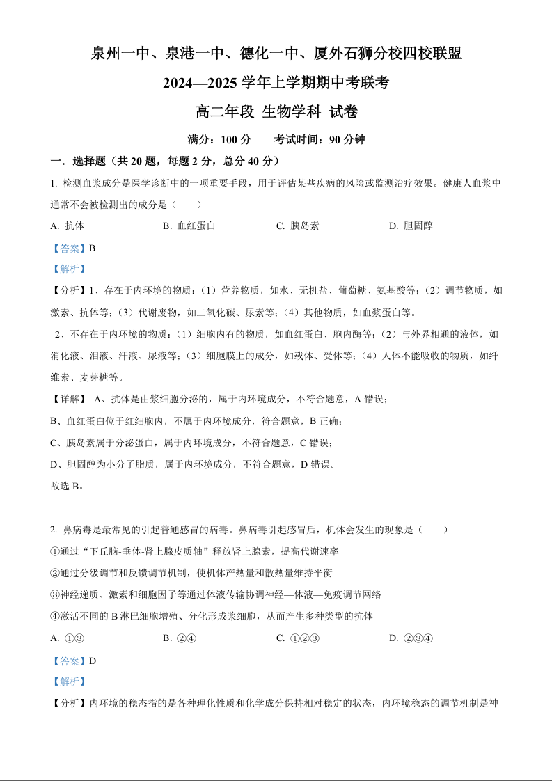 福建省名校协作体四校联考2024-2025学年高二上学期11月期中考试生物(精品解析版)
