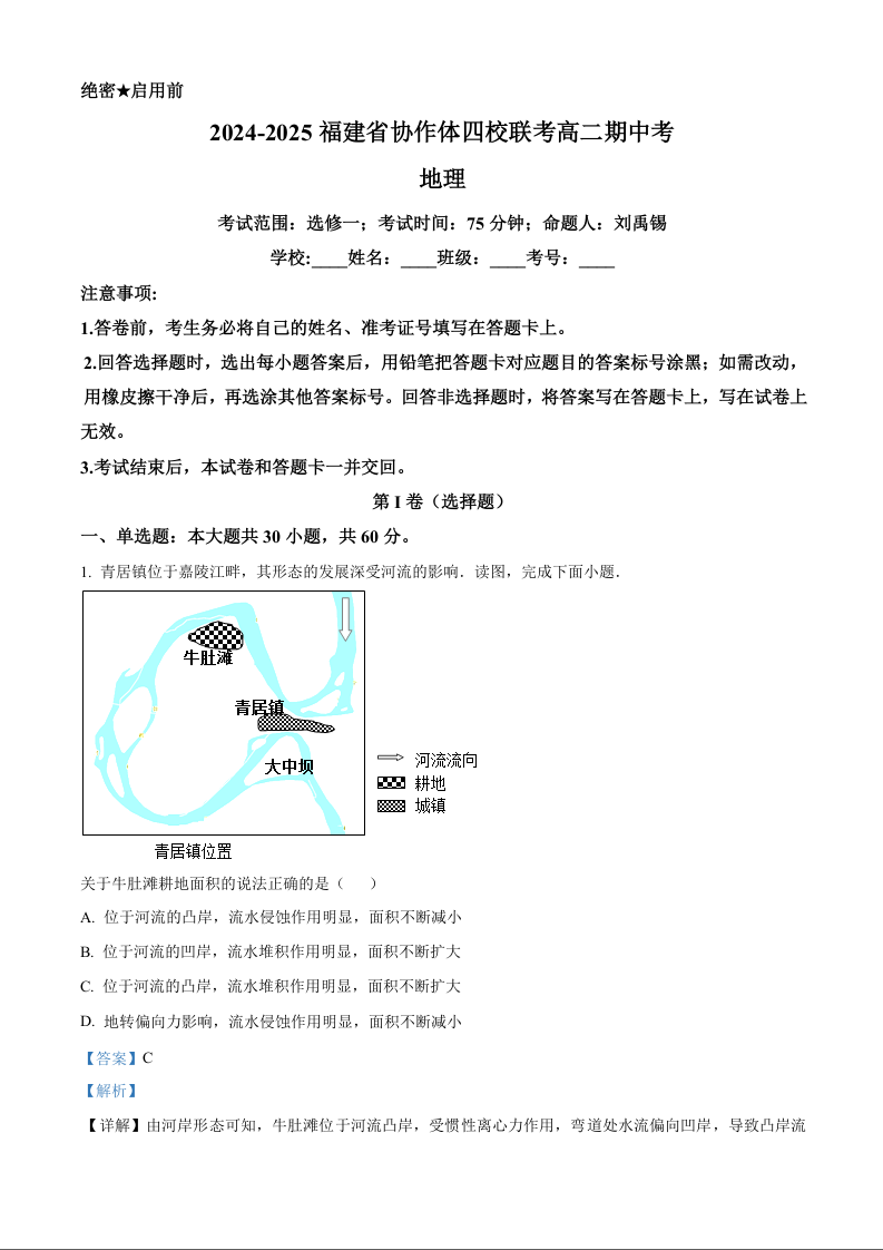 福建省名校协作体四校联考2024-2025学年高二上学期11月期中考试地理(精品解析版)